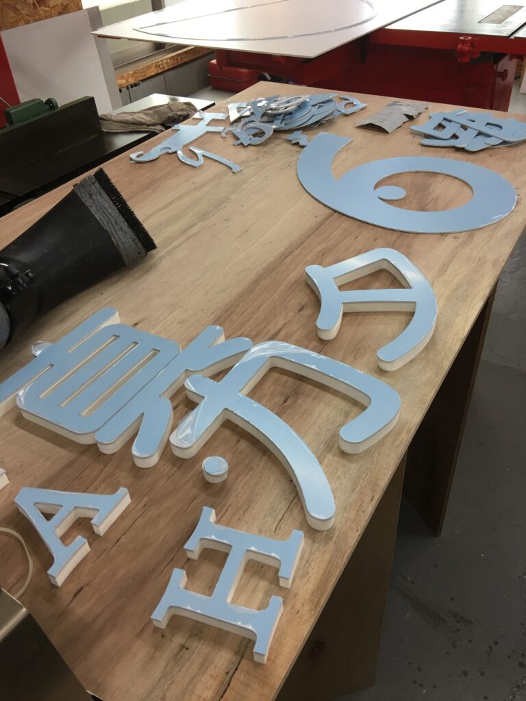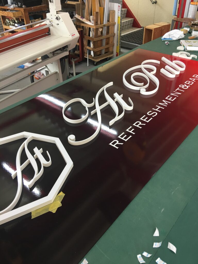 主には表面にシートを貼り、側面を別の色で塗装も行えます。インクジェット出力を貼ることも可能です。一般的には文字の高さの約10分の1の厚みでご依頼頂くと立体的で綺麗な見た目となります。