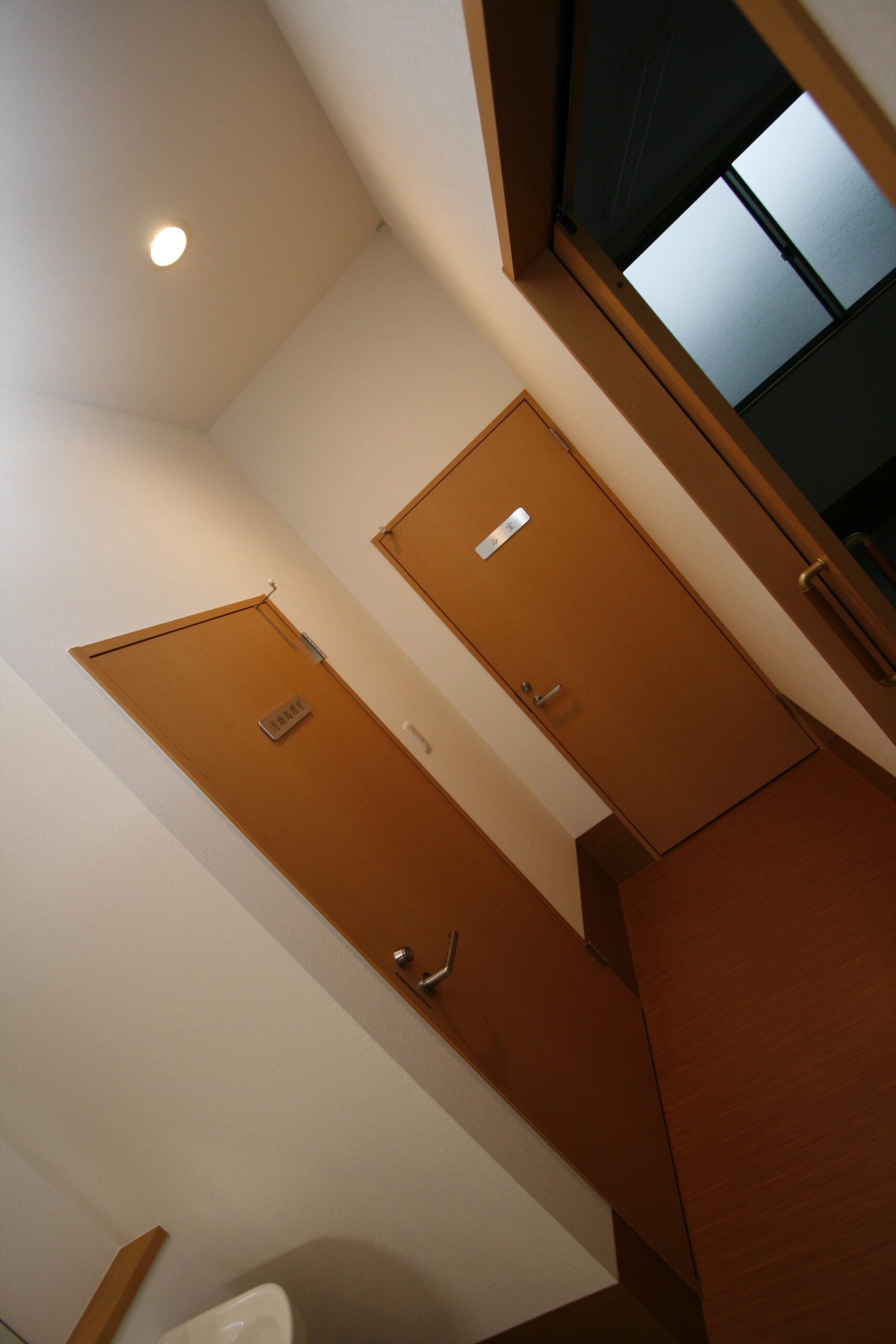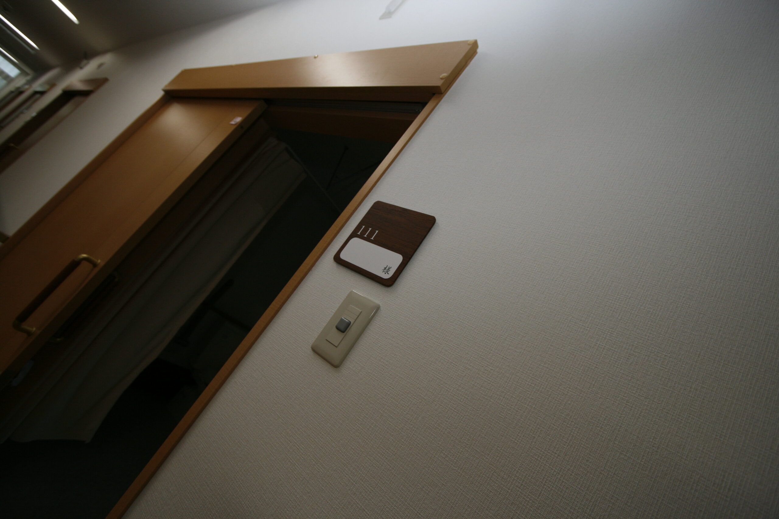 衝突防止用に自動ドアにカッティングでラインを入れています。(インターフォン上に木目表札)