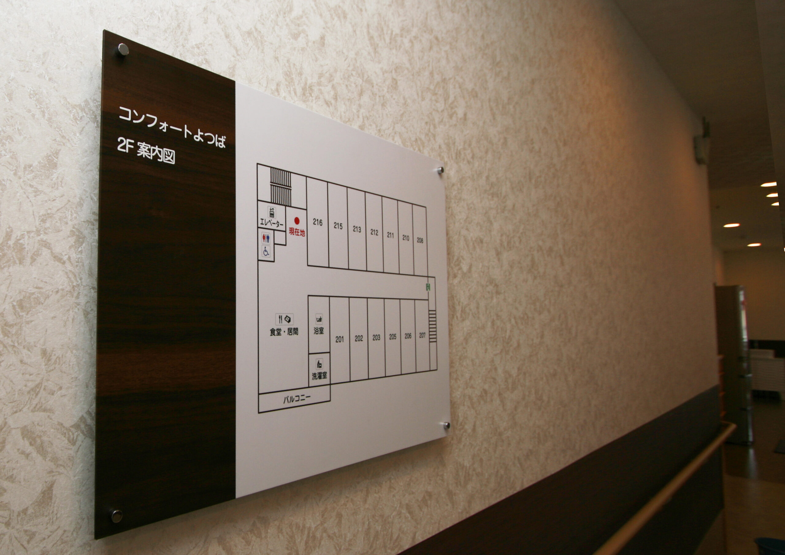 ダイノックシート、化粧ビスを使用、室名札を壁面より20mm程浮かせて施工、建具とのバランスです。また建具より高さは抑えておりますのでご利用者さんの日常生活において邪魔になることや、ぶつかってしまうなどの危険は極力抑えられています。長年の使用で問題ないよう、ボードアンカーを使用して確実に取付を行っています。