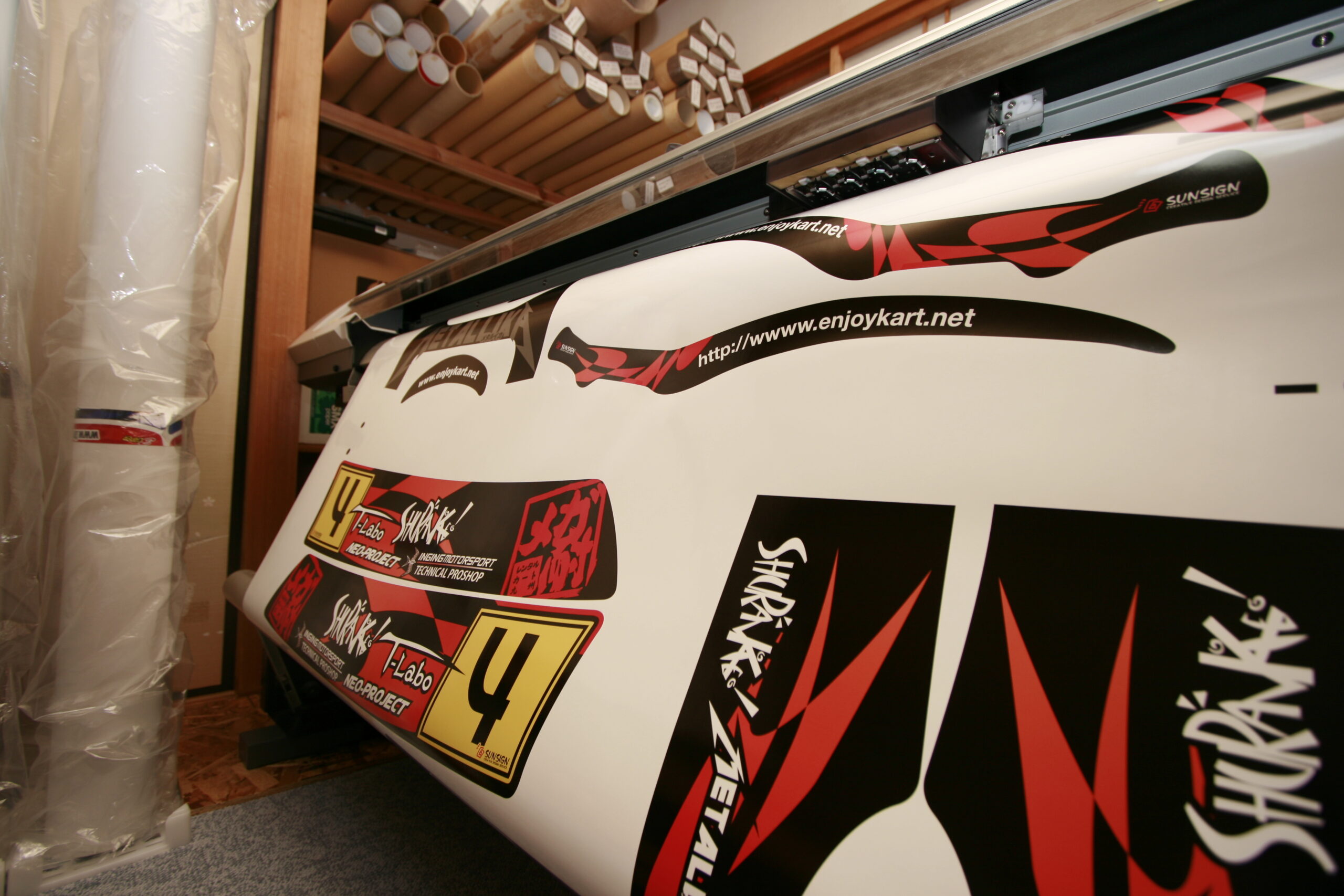 レンタルカート(大人用ゴーカートとでもいいましょうか)用のボディカウルステッカーの出力です。「F1レーサーもまずはカートから」という程、モータースポーツの根底を支えるカテゴリーなのです。近年では、スポーツドリンク?えっと、エナジードリンクですかね、そうドリンクで有名なレッドブルが全国でイベントを行っています。
